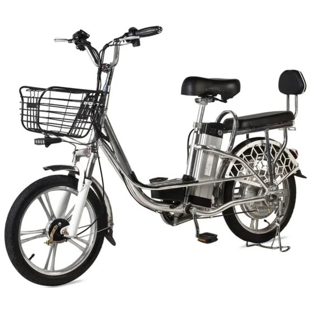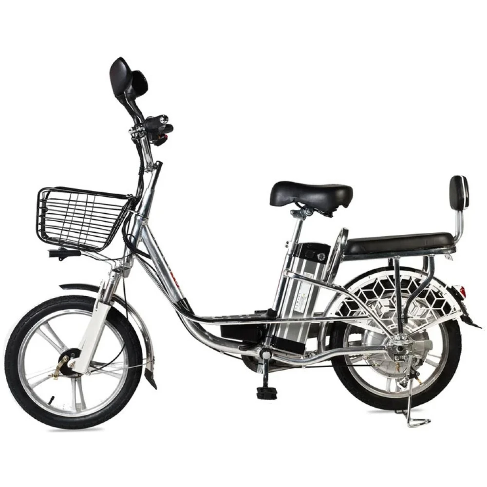 Электровелосипед оснащен большими устойчивыми колесами, мягким сиденьем для водителя и пассажира. Второе имеет удобную спинку, снижающую нагрузку с позвоночника. Техника оснащена всем необходимым для активного время провождения, поездки в магазин
