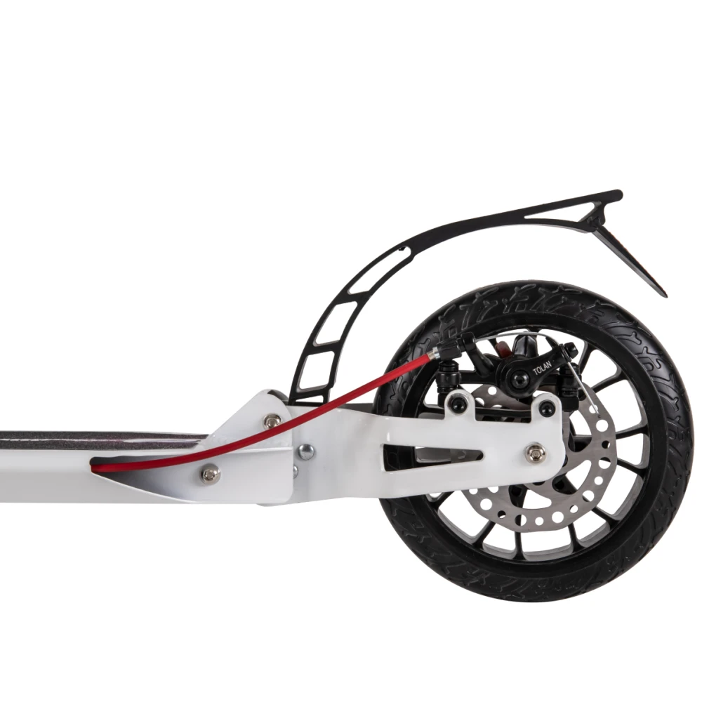 Относительно небольшой вес модели позволяет легко и свободно маневрировать. Оригинальный руль можно корректировать в зависимости от роста райдера для удобства поездок. Техника оснащена современной тормозной системой, удачно сочетает дисковые и ножные тормоза. Резиновые накладки на руль имеют рифленую поверхность для лучшего сцепления с руками.