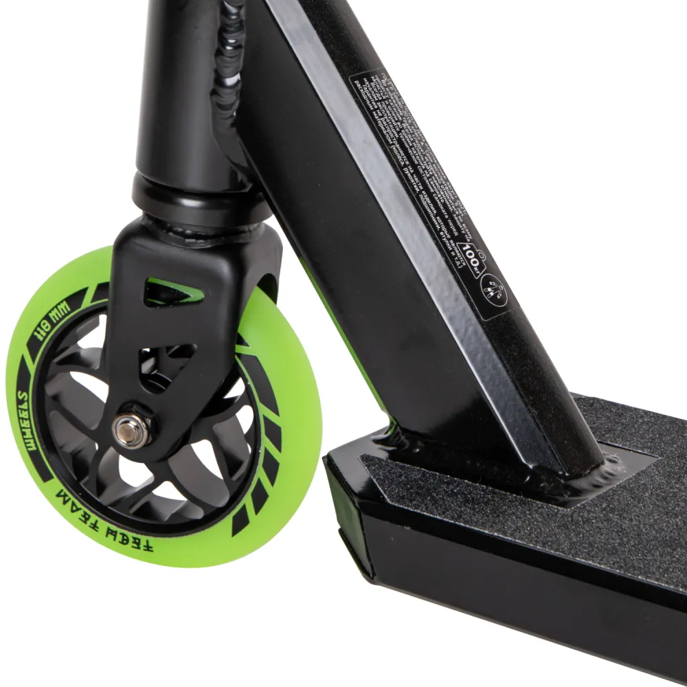 Повышенная комфортность модели обеспечивается благодаря удобной рулевой части, выполненной из высокопрочной стали. Главным для производителя остается безопасность пользователей при движении и выполнении трюков. Для этого техника оснащена оригинальной задней ножной тормозной системой. Конструкция техники надежна и долговечна, полностью устойчива к различным повреждениям. Модель оснащена яркими светящимися колесами для любителей передвижения в темное время суток. На руле расположены прочные резиновые накладки для правильности расположения рук и безопасности при движении.