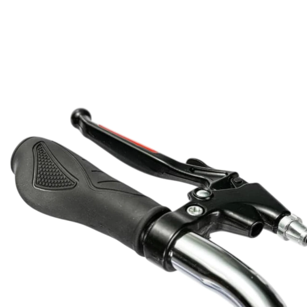 Колёса 20" с широкими протекторами обеспечивают сцепление на грунте/гравии; дисковые вентилируемые тормоза (перед+зад) эффективно тормозят при нагрузке 170 кг. Амортизационная вилка гасит вибрации на неровностях, улучшая контроль; 1 скорость подходит для ровных дорог, на подъёмах требует усилий. Нет режимов или мотора — энергоэффективность высокая за счёт простоты (реальный пробег не ограничен топливом, ~50–100 км/день педалированием).